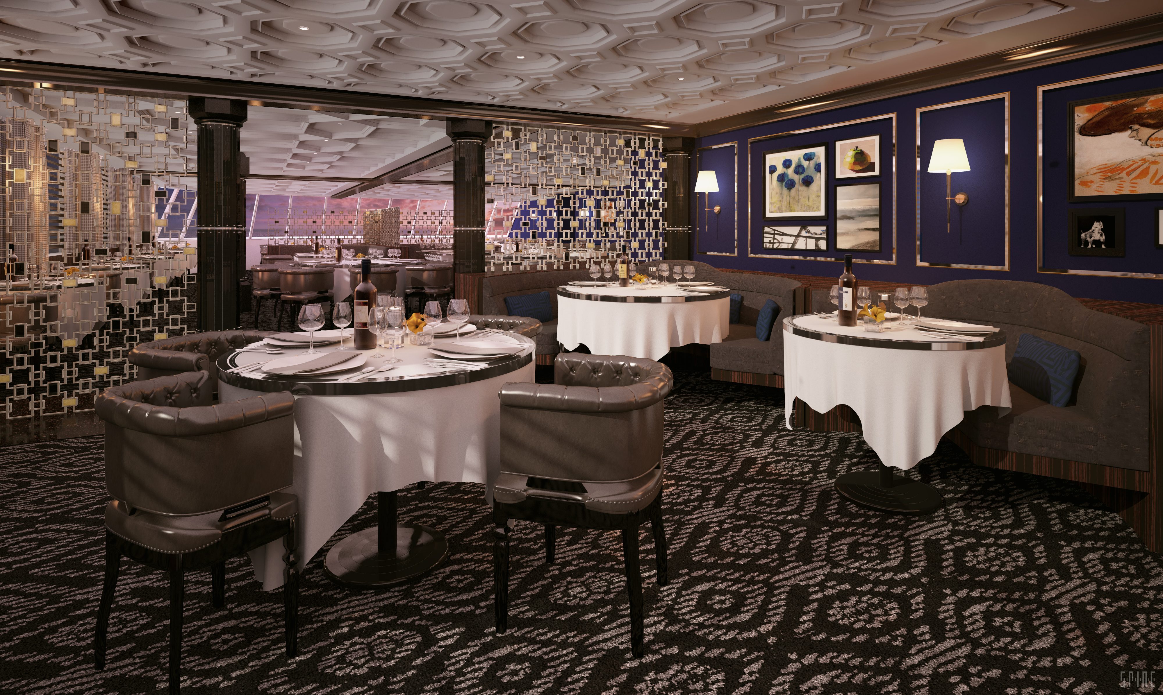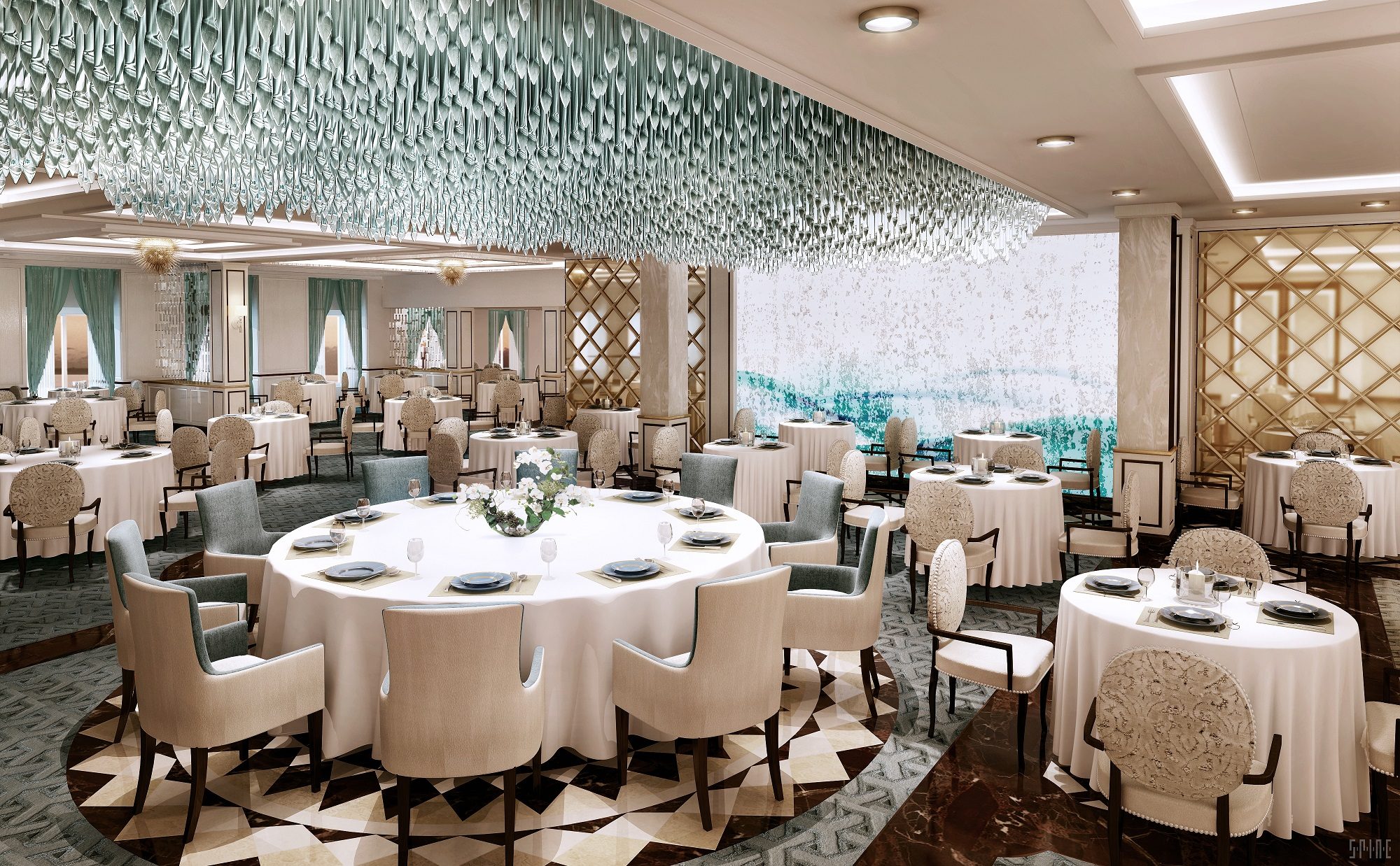 Much thought was given to the design of Compass Rose, the flagship restaurant of our fleet. The dining room is outfitted with rich woods contrasted by light marble stones and mother of pearl shimmering brightly with an elegant color theme of light shades of blue, white, gold and silver. Compass Rose delights with a beautifully defined atmosphere and transitions from refreshing natural light during the day to a romantic ice blue lighting theme at night. This is the perfect setting for you to enjoy your breakfast, lunch and dinner, where the menu features an exceptional variety of Continental cuisine.