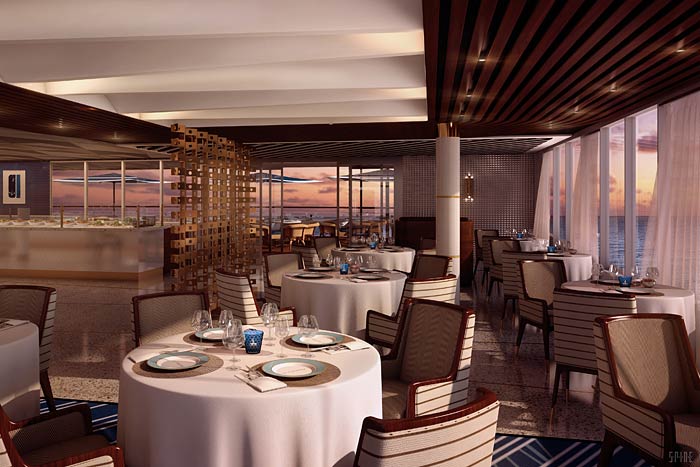 [jtabs] Regent Seven Seas Explorer :: Seven Seas Explorer is spaciously intimate, breathlessly elegant and perfectly staffed to offer Regent Seven Seas Cruises’ special brand of all-inclusive luxury. The summer of 2016 will herald not only the launch of the most luxurious ship to sail the seven seas, but also the moment when you can experience the new standard in elegance and sophistication. Journey to the world’s most beautiful places in spacious designer suites, indulge in a decadent treatment at the world renowned Canyon Ranch SpaClub, enjoy a musical performance in a plush lounge, and delight in extensive gourmet dining throughout the day and night. [jtab/] Dining :: Dine whenever, wherever and with whomever you choose in any of our open-seating restaurants. Simply request a table when the mood strikes and the Maître D’ will happily seat your party. Using fresh local produce, dry-aged prime meats, fish and seafood sourced from international markets, delicious artisan cheeses and scrumptious baked goods crafted from the finest imported French flour, combined with all the skills and imagination of our celebrated chefs to put it all together — cruising has never tasted so good. Menus change daily in Compass Rose as a multitude of Continental-inspired dishes are offered during the course of your voyage. Indulge in a Sunday champagne and caviar brunch at La Veranda or at Compass Rose. Dine in elegant surroundings including the iconic Prime 7, the premier steakhouse at sea, and delight in mouth watering entrées paired with distinctive complimentary wines and spirits. [jaccordion] Compas Rose ::