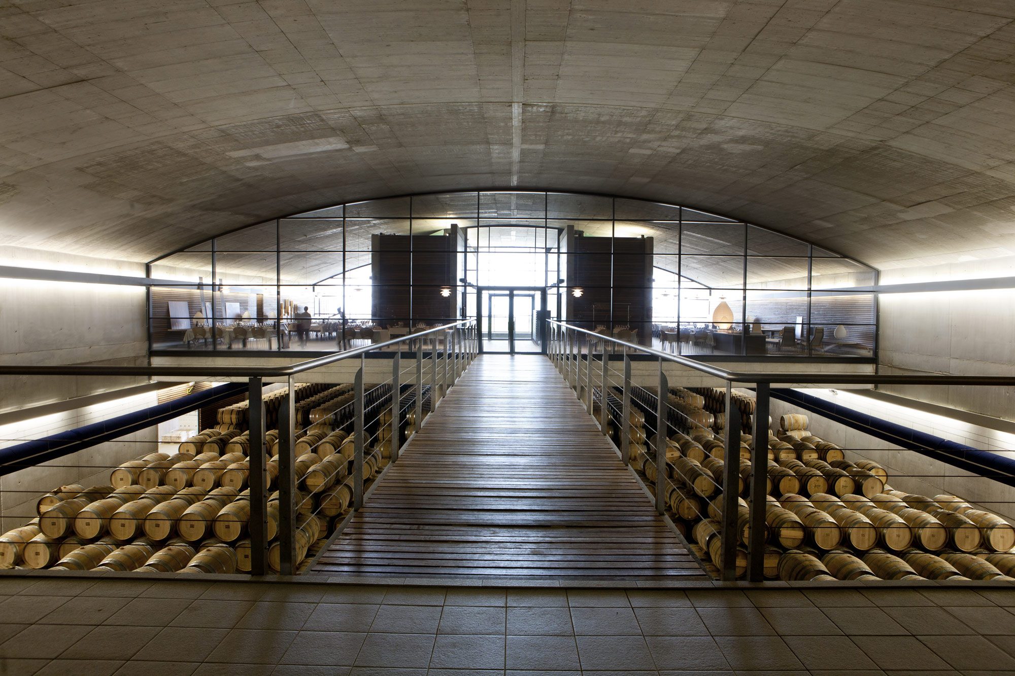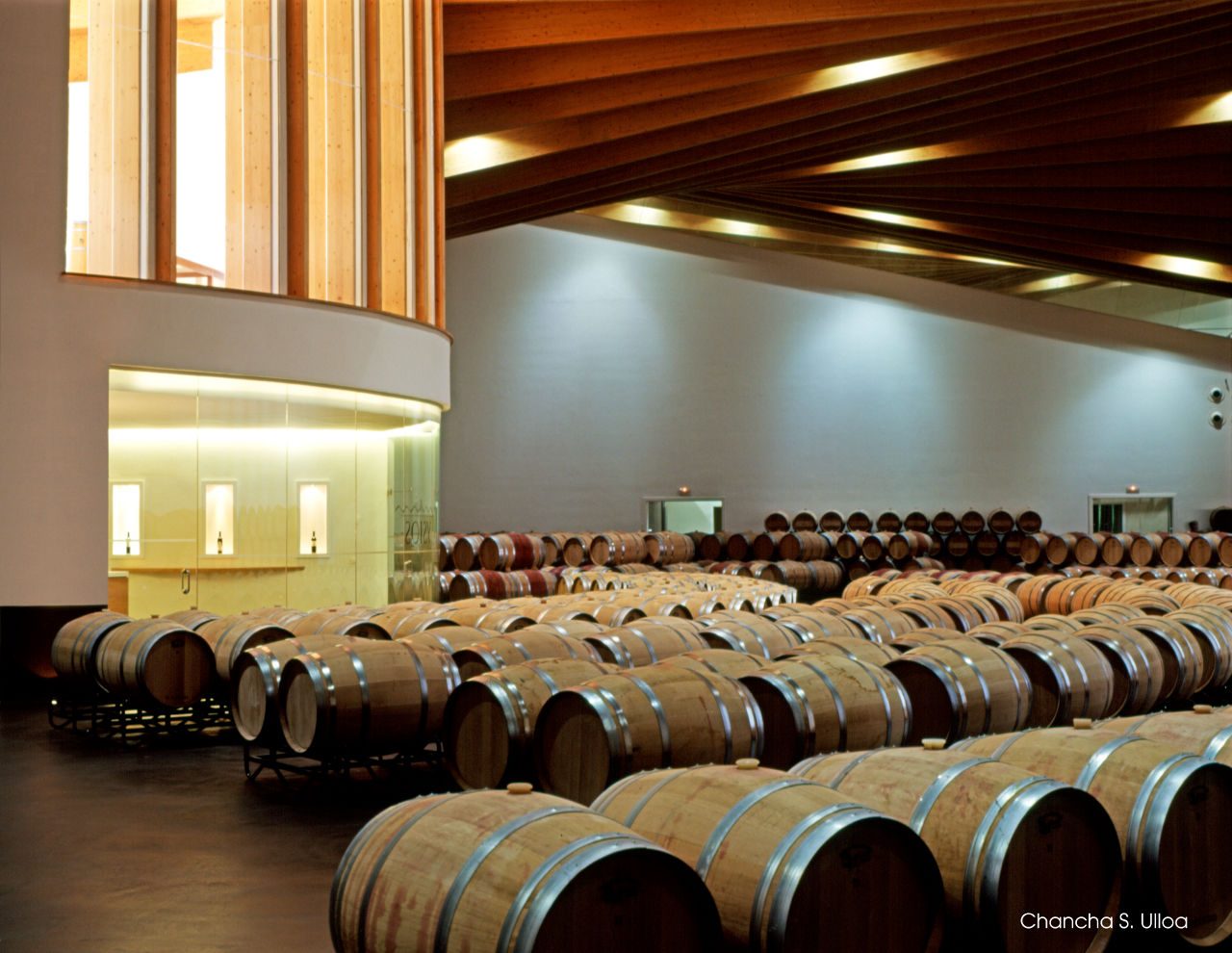 The new winery building in Laserna is home to the production and aging of the Viรฑa Real family of wines. The compelling architecture, the work of Bordeaux-based architect Philippe Mazieres, makes an impression and leaves no room for doubt: Viรฑa Real is devoted to innovation and experimentation, the pillars of the company. The vat-shaped structure is the heart of the winery, housing the fermentation room where the wine takes shape. It also includes a Canadian red cedar structure and two long tunnels drilled into the hillโs bedrock, where the wines are aged.